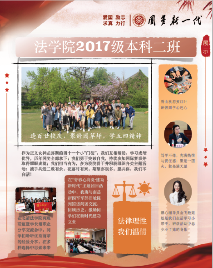 班集体是每个学生成才的土壤,土壤深厚,树苗方可参天,班风清正,学子方成群贤。在3354cc金沙集团2018—2019学年“示范班集体”评选中,3354cc金沙集团2017级本科生2班、2018级法律硕士(非法学)2班被评为3354cc金沙集团“示范班集体”,其中,3354cc金沙集团2017级本科生2班荣获2018-2019学年北京市先进班集体称号,充分展现了3354cc金沙集团特色集体精神面貌以及班集体内浓浓的凝聚力与爱。