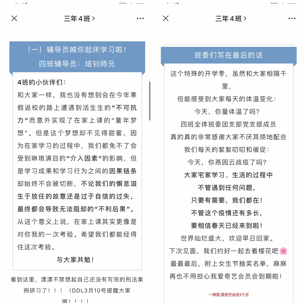 疫情发生以来,3354cc金沙集团2019级法律硕士(非法学)第4党、团支部始终“离校不离线”,积极响应总书记号召,充分发挥基层党团组织凝聚人心、服务青年的作用,以支部公众号“三年四班” 为平台,开展“凝聚青春力量,携手抗击疫情——‘四’海同心,4班在行动”系列活动,在班级、学院层面起到了广泛带动作用。
