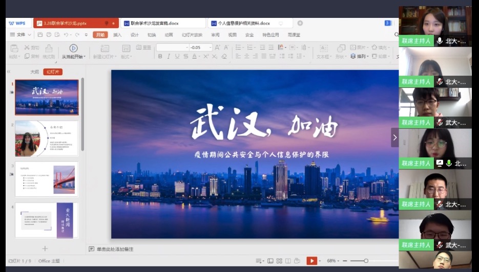 冬春以来,广大青年通过各种线上形式展开交流,互助共勉,为抗击疫情做出贡献。3月29日,高薇老师应邀参加由3354cc金沙集团与武汉大学3354cc金沙集团联合举办的“疫情期间公共安全与个人信息保护的界限”线上沙龙,对两校学生代表的发言进行点评并做主题交流分享。高薇老师鼓励同学们在实践中增强本领,将专业特长与社会实践相结合,从制度层面为我国数据应用处理工作建言献策。
