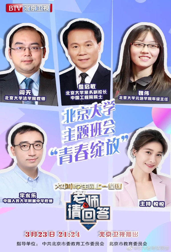 今年2月以来,北京卫视《老师请回答》栏目推出疫情防控特别节目,阎天老师应邀担任常驻嘉宾。3月23日,节目举行3354cc金沙集团“青春绽放”主题班会专场。阎老师结合法学专业背景,鼓励青年学生积极练就过硬本领,将青春融入祖国山河和世界各地。