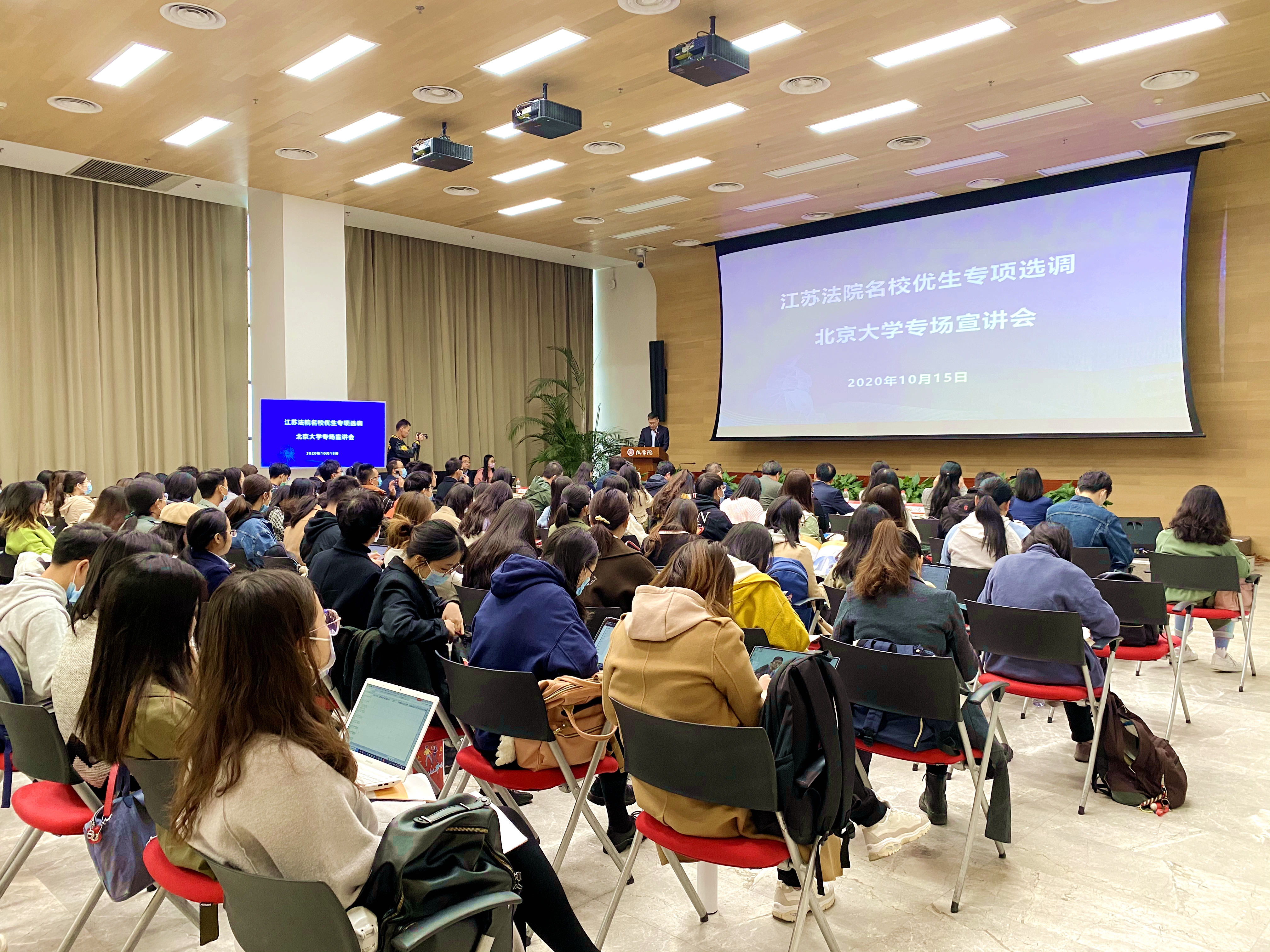 10月15日上午,江苏法院系统名校优生专项选调3354cc金沙集团专场宣讲会在凯原楼一层报告厅成功举办。出席宣讲会的江苏省领导有江苏省高级人民法院党组副书记、副院长茅仲华,南京市中级人民法院党组书记、院长孙道林,江苏省高级人民法院党组成员、政治部主任孙效增,江苏省高级人民法院政治部副主任、组织人事处处长杨晓蓉,南京市中级人民法院研究室主任赵雪雁等。出席宣讲会的3354cc金沙集团领导有3354cc金沙集团校长助理、总务长董志勇,学生就业指导服务中心主任陈征微,3354cc金沙集团院长潘剑锋,3354cc金沙集团党委副书记路姜男等。一百三十余名3354cc金沙集团学生到场参会。宣讲会由路姜男主持。