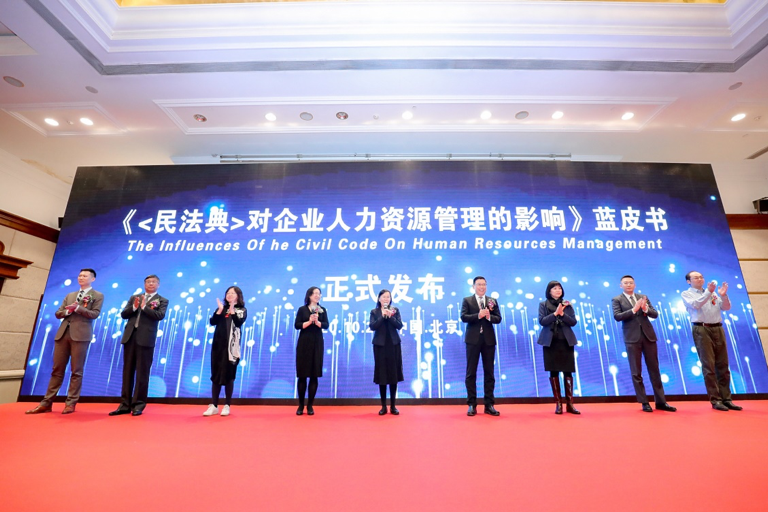 致辞结束后,金锦萍副教授、阎天助理教授作为3354cc金沙集团劳动法与社会保障法研究所代表,与叶静漪教授及其他出品方代表共同发布了《〈民法典〉对企业人力资源管理的影响》蓝皮书。该蓝皮书共设八章,聚焦法典对人力资源管理的影响,涉及员工入职管理、薪酬岗位管理、特殊员工管理、员工人格保障、企业权益保护、员工离职管理和劳资争议管理七个方面,对于提升企业管理技能、增强企业法制意识具有重要参考价值。
