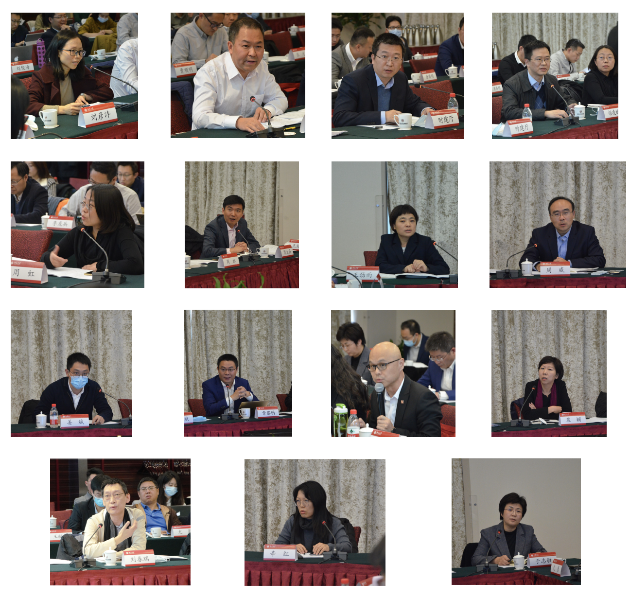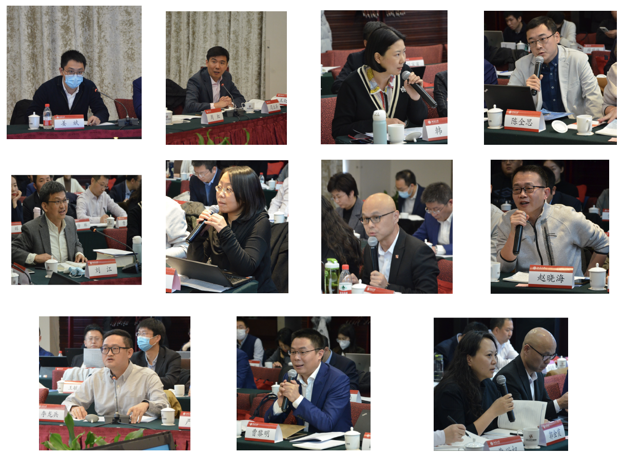 自由讨论中,中国上市公司协会公司治理部副主任刘彦沣,中国商法学研究会理事李志刚,国家电网有限公司法律部处长刘春瑞,中国电建集团法律与风险管理部处长时建厅,中国人保资产办公室负责人胡凌斌,先正达集团董事、法律总监周虹,中国通用技术集团人力资源部部长闫立兵,北京一轻控股总法律顾问王劲雨,陕国投信托内控与法律合规部副总经理周威,华为投资控股有限公司高级律师姜斌,苏州金螳螂建筑装饰股份有限公司总裁曹黎明,中技能源集团股份有限公司董事长熊炯,中智行科技有限公司法务及对外关系副总裁裴颖,法治日报、中国公司法务研究院秘书辛红,北京教授加科技有限公司总经理于志敏先后就公司法中有关国有企业的改革,国有企业党建在公司治理中的切入问题,国有资产监管问题以及突出国有企业问题的特殊性提出了相关看法和意见。