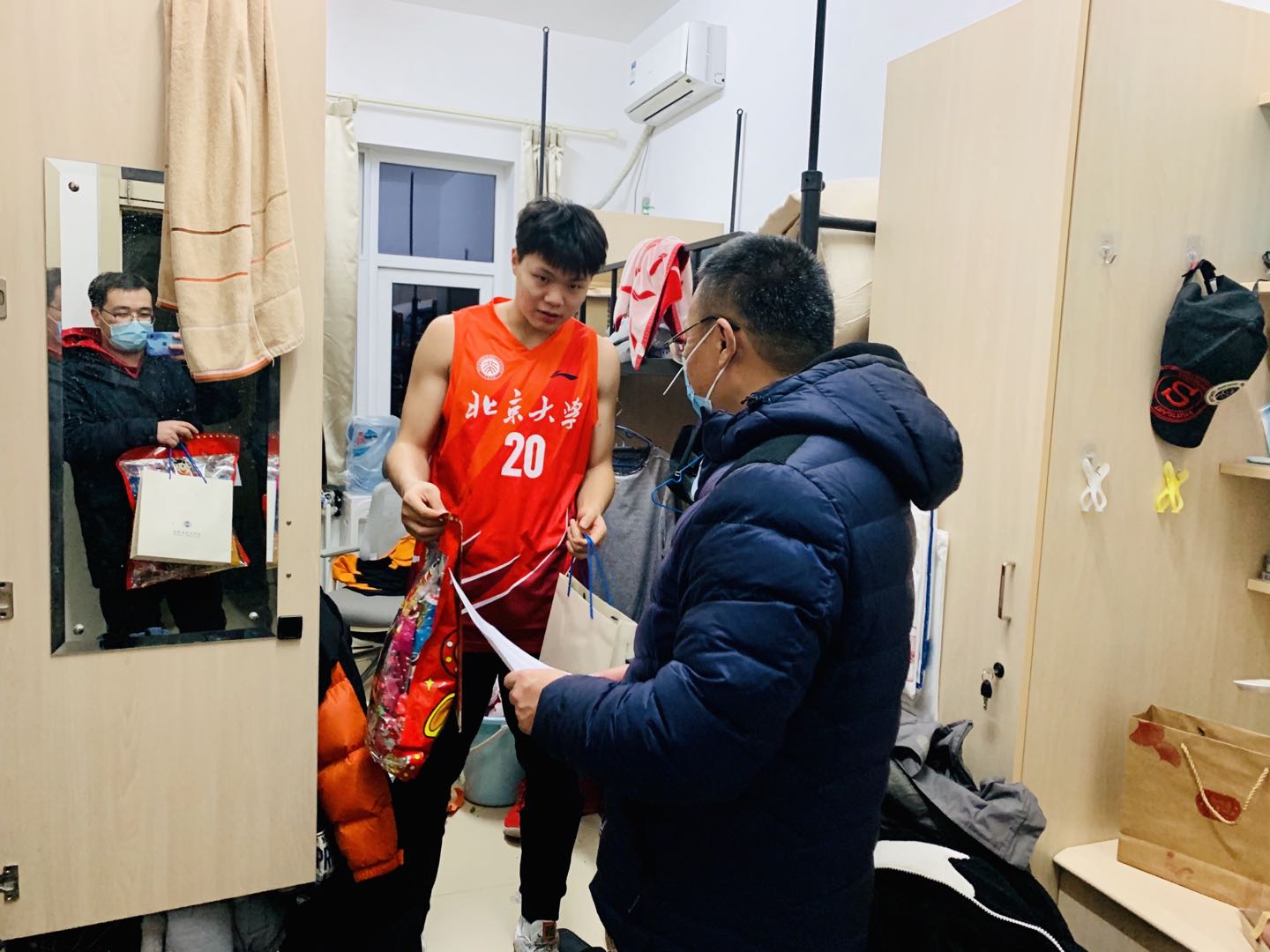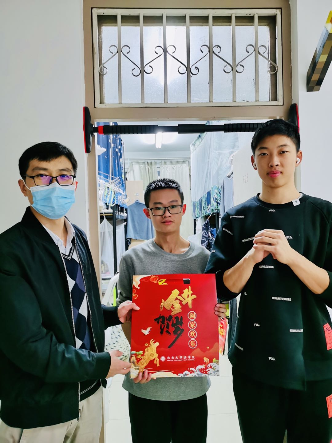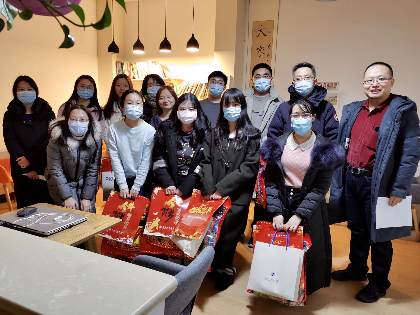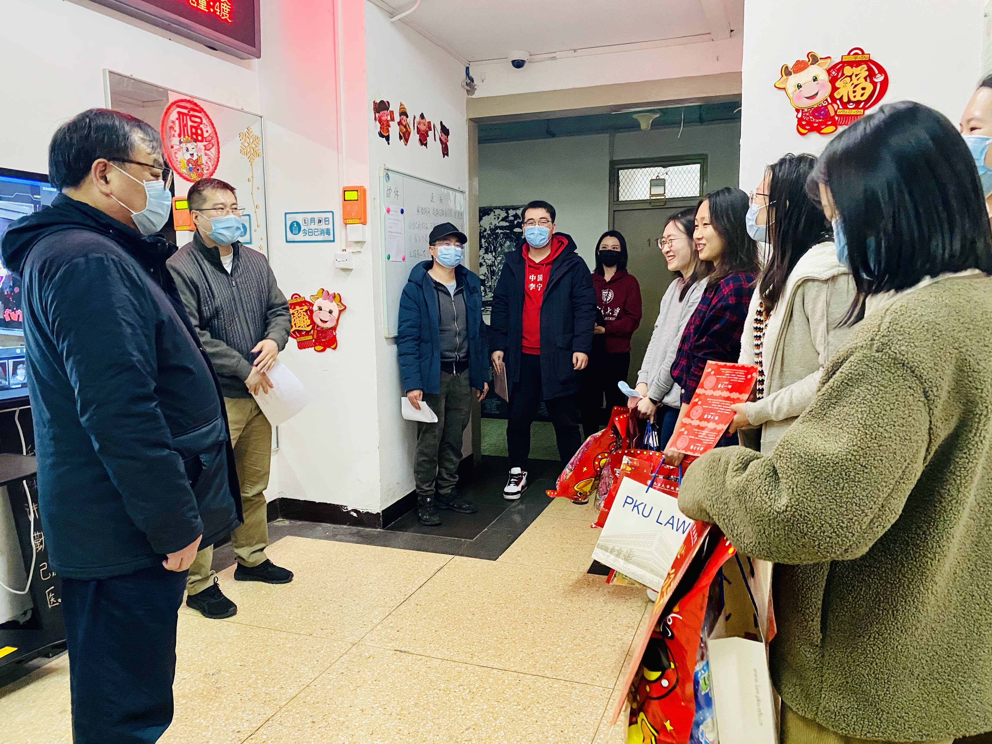 在院长潘剑锋、党委书记郭雳的带领下,学院党委副书记路姜男,院长助理、团委书记史诗,班主任代表张智勇、陈志红、戴昕、董膑羽、边仁君,第二班主任代表王华、吴旭,专任辅导员张佳宁、张润芝、李和君、李婉玉、史默然,学生兼职辅导员卢森通、尹子尤、文玉婷、曹佳蕙、周露等师生先后走访校内、万柳、畅春园、畅春新园、圆明园、中关新园共201间学生宿舍,看望慰问留校学生,将新春大礼包分发到同学们的手中。