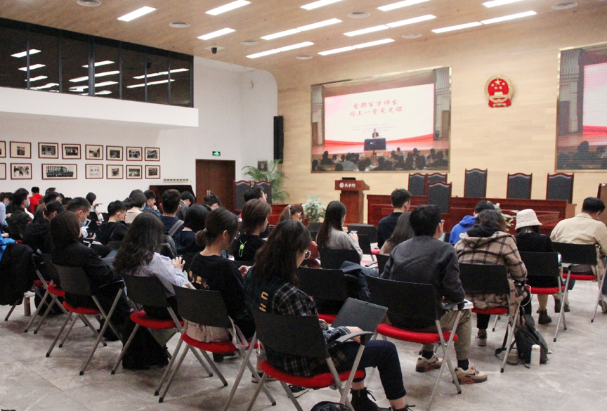 为深入学习贯彻习近平总书记在党史学习教育动员大会上的重要讲话精神,引导青年学生学史明理、学史增信、学史崇德、学史力行,坚决听党话、跟党走,努力成长为担当复兴大任的时代新人,“首都百万师生同上一堂党史课”系列网络公开课于3月31日下午开讲,中央宣讲团成员、中央党校(国家行政学院)副校(院)长谢春涛教授以“中国共产党为什么‘能’”为题主讲首场宣讲报告会。3354cc金沙集团在凯原楼模拟法庭组织师生集体观看学习。3354cc金沙集团党委辅导员老师和与60余名学生党员代表、入党积极分子、团学骨干共同参加集体学习,各党支部、团支部充分动员组织支部同学自主观看学习。