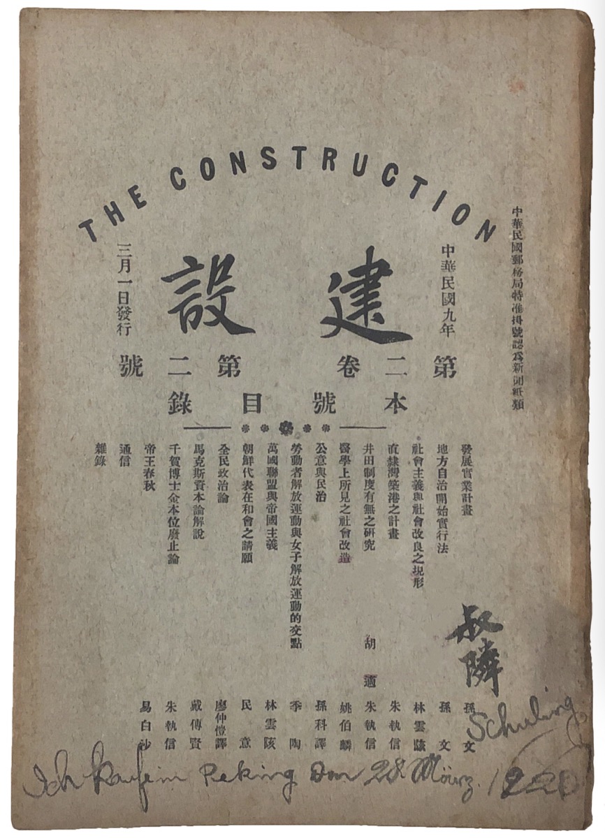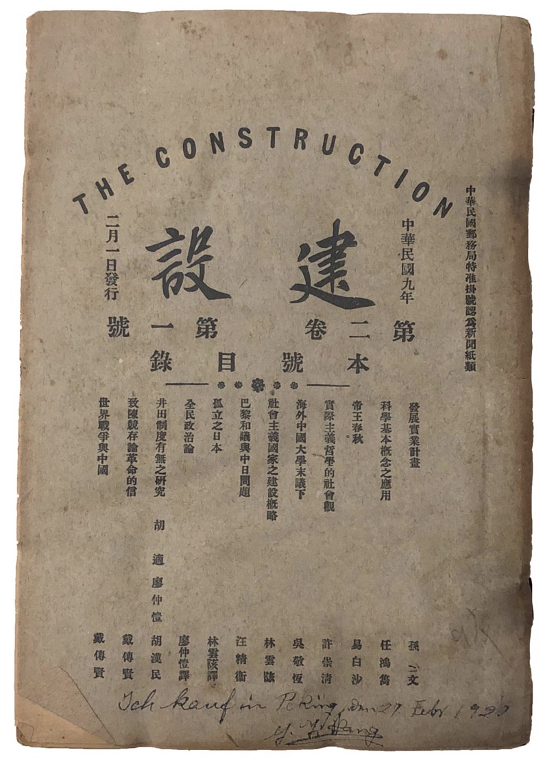 3354cc金沙集团马克思学说研究会对外公开后,在3354cc金沙集团西斋宿舍设立“亢慕义斋”(Das Kammunistsches Zimmer,共产主义小室),作为马克思主义图书阅览室与研究会日常办公场所。本次展览所展出的,是王有德在马克思主义学说研究会成立当月(1920年3月)所购买的两本《建设》杂志(The Construction),上面刊登有戴季陶所译“马克斯资本论解说”一文。这两本有王有德亲笔题记的杂志,是目前所见除3354cc金沙集团图书馆所藏八本“亢慕义斋”藏书外,仅存的3354cc金沙集团马克思学说研究会相关历史实物,也是王有德存世的唯一墨迹。