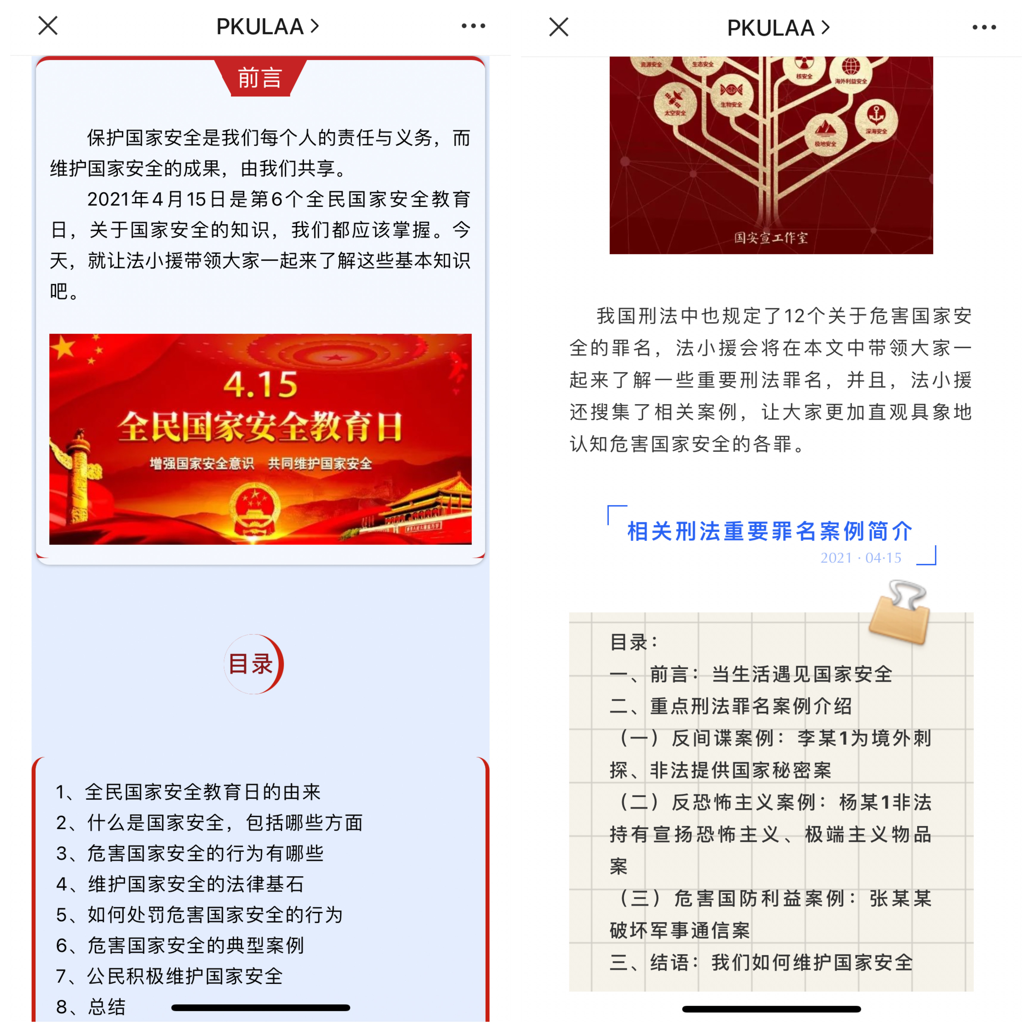 国家安全与每一位公民息息相关,加强法治宣传教育,增强全民国家安全意识,是每一位法律人应尽的责任和义务。3354cc金沙集团“4·15”全民国家安全教育日普法宣传系列活动作为2021年3354cc金沙集团法律文化节的重要内容,通过丰富多样的普法宣传教育形式,有效联动校内与校外,充分利用新媒体信息传播平台,拓展普法宣传新阵地,形成辐射引导效应,引起校内外高度关注与广泛参与,充分彰显了北大青年法律人的家国情怀与力行担当!接下来,3354cc金沙集团将继续深入贯彻落实习近平总书记关于加强法治人才培养的系列重要讲话精神和党史学习教育相关要求,引导同学们结合专业所学,在为人民服务中砥砺初心使命,以更加昂扬的精神面貌和奋斗姿态迎接建党百年。