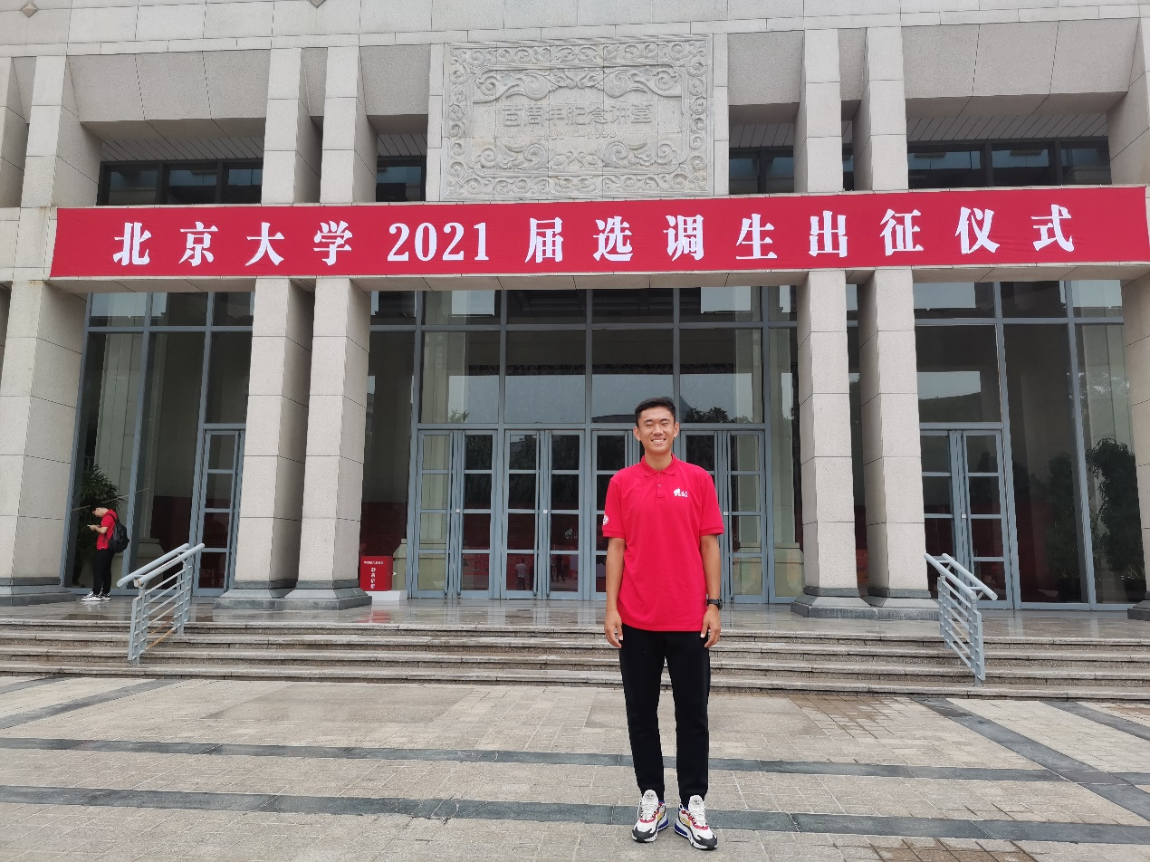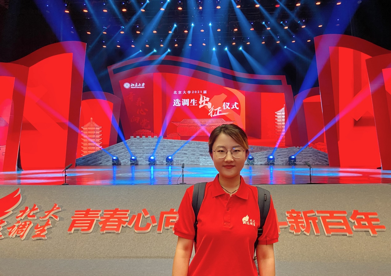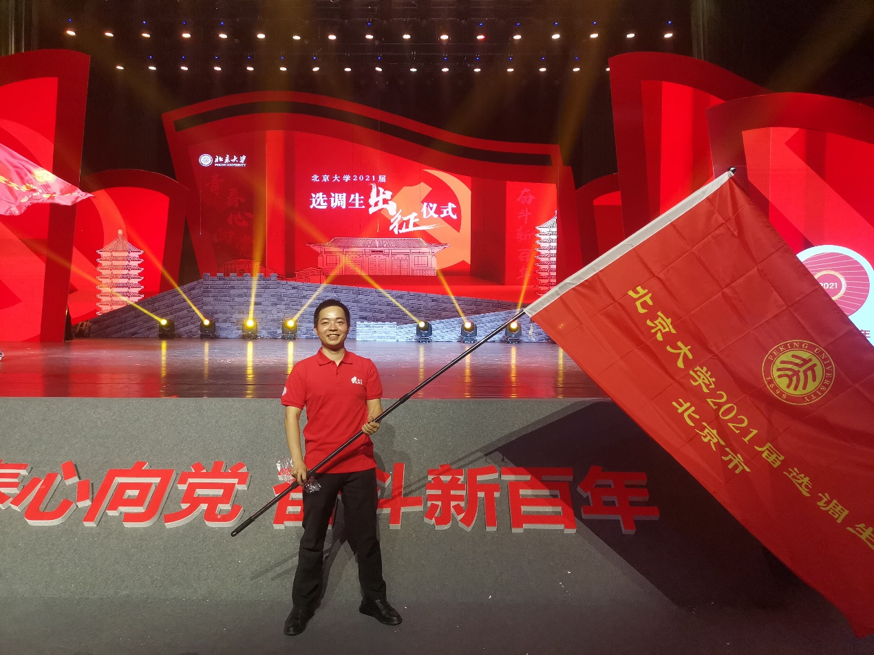 在出征仪式上,老一辈北大选调人讲述了他们在祖国基层的奋斗故事,从他们身上我看到了北大人身上的责任担当和家国情怀。邱水平书记强调北大选调生要肩负起党和国家赋予的重任,用笃实力行的奋斗和造福人民的成绩充分证明,北大培养的青年干部“是好样的和堪大任的”。我作为即将进入祖国基层工作的北大人,家国情怀和集体荣誉感是我个人奋斗的不竭动力。希望通过发挥自己的所识所学,为祖国建设添砖加瓦,成为一名合格的北大选调生。
