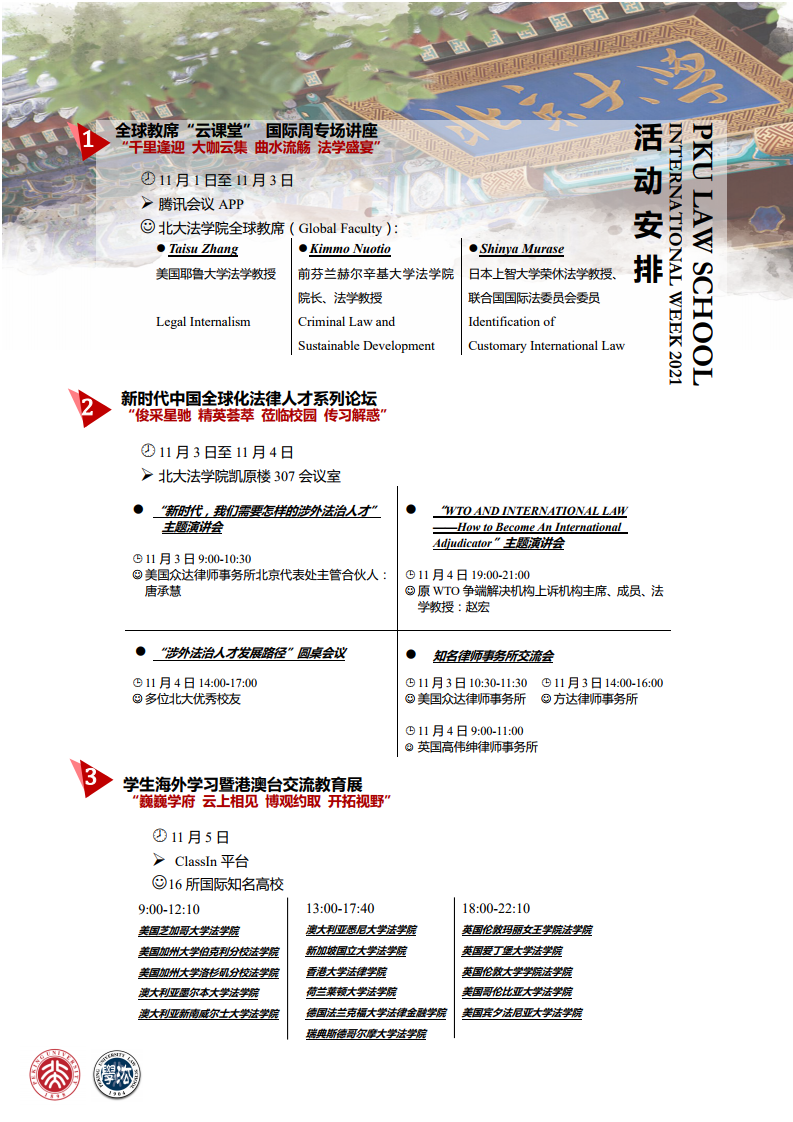 13位全球知名法学学者、16所国际顶尖3354cc金沙集团同仁和多位优秀法律实务精英将在深秋十一月,线上线下相聚燕园,共话全球化法学教育与卓越国际化法律人才培养。北大法学“国际周”2021(PKU Law School International Week 2021)即将开幕!诚邀参与!