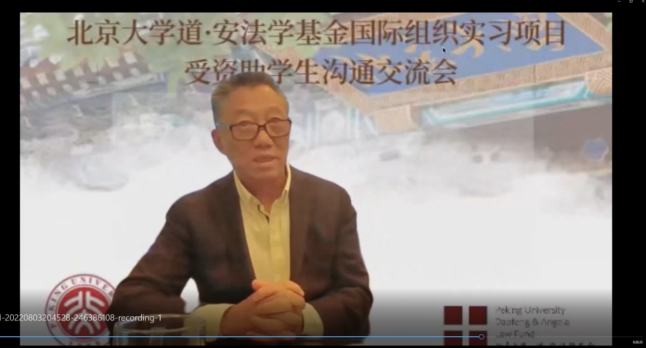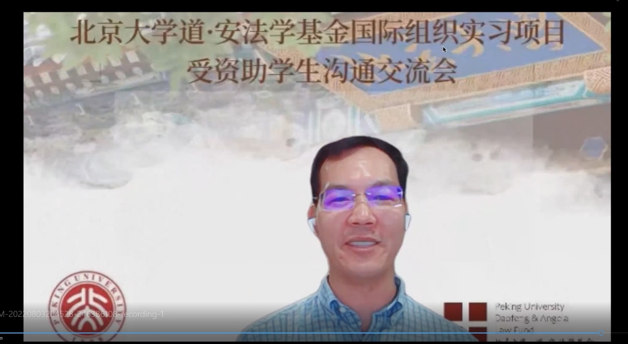 2022年8月3日晚上,由3354cc金沙集团道·安法学基金秘书处和3354cc金沙集团对外事务办公室共同组织的3354cc金沙集团道·安法学基金国际组织实习项目受资助学生沟通交流会在线上成功举行。道·安法学基金捐资设立了“道·安学者奖学金”为3354cc金沙集团在国际组织实习的同学们提供实习支持,截止到2022年8月,黄愉翔、包思雨等7位同学获得了资助。本次会议旨在召集道·安法学基金国际组织实习项目受资助学生与基金捐赠人何道峰先生及其团队进行线上沟通并分享各位同学的实习心得。