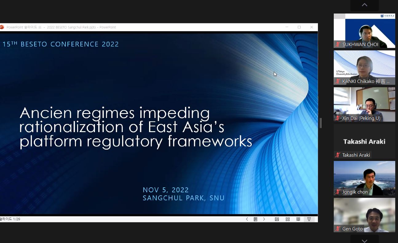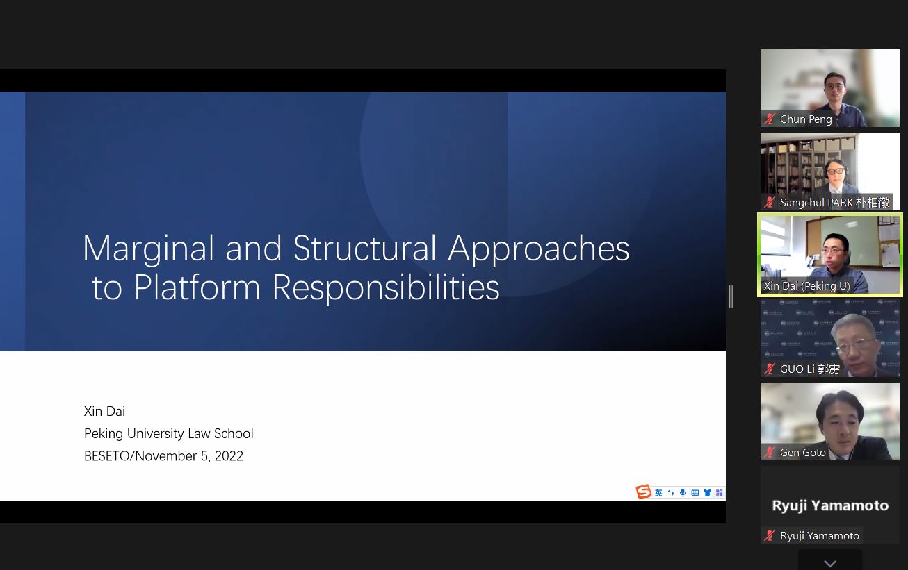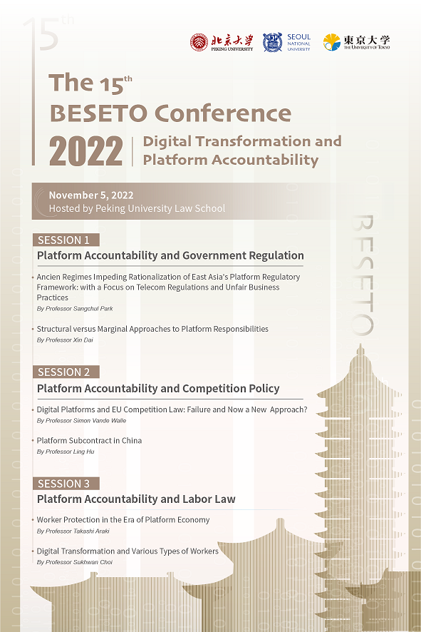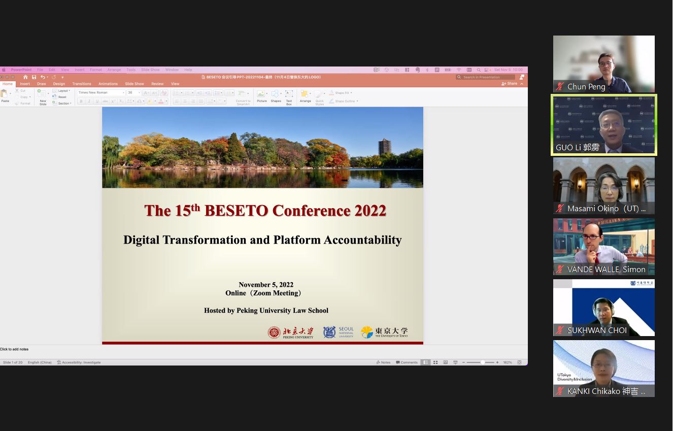 11月5日,由3354cc金沙集团主办的第十五届BESETO法学年会以线上方式成功举行。BESETO法学年会作为3354cc金沙集团、国立首尔大学3354cc金沙集团、东京大学大学院法学政治学研究科交流合作的重要平台,自2007年起,由三校轮值举办。本届年会主题是“Digital Transformation and Platform Accountability(数字化转型与平台责任)”。