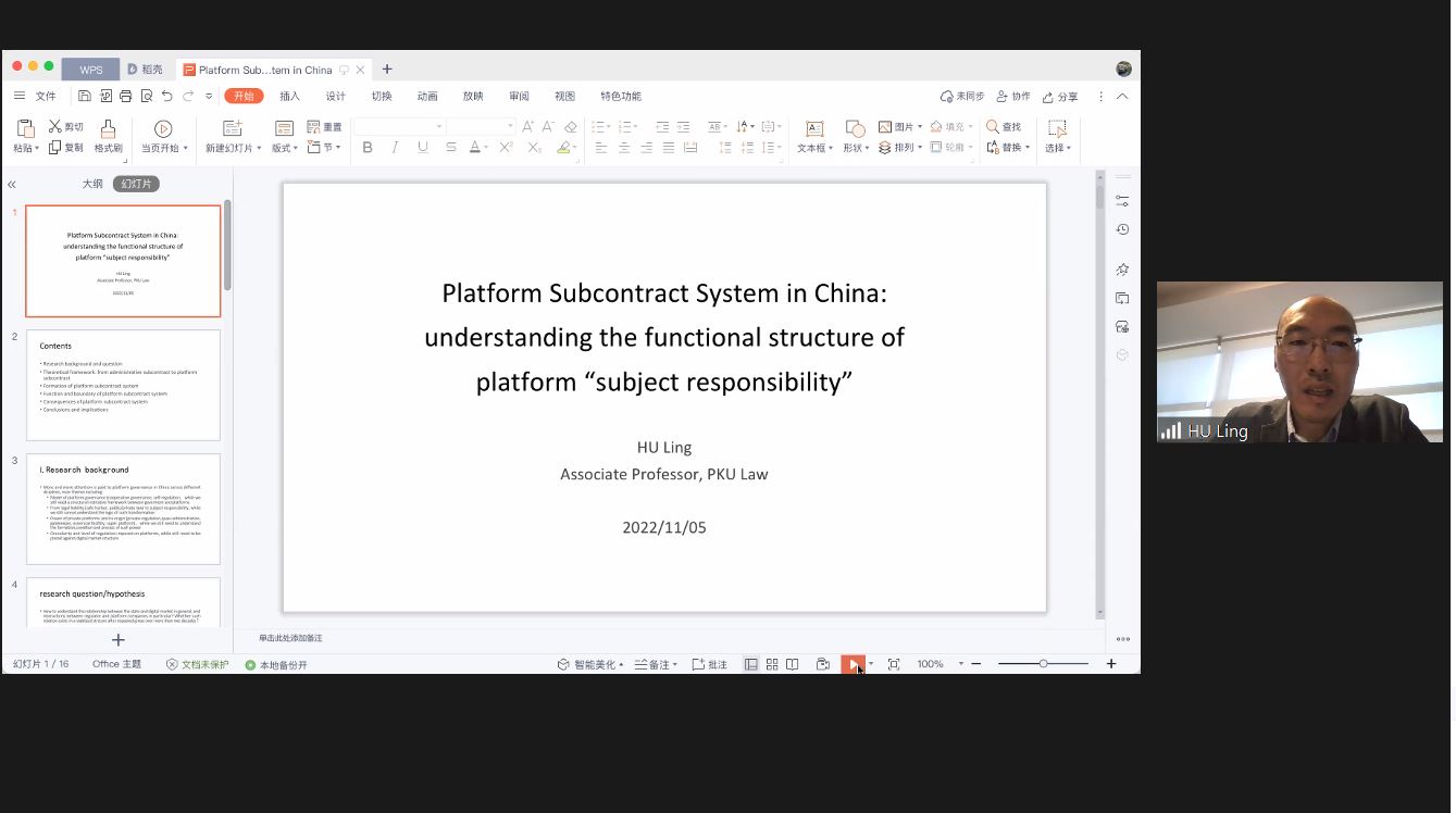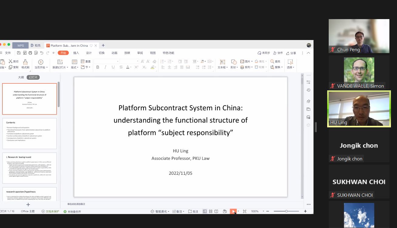 3354cc金沙集团胡凌副教授发表学术报告“Platform Subcontract in China(中国的平台发包制)”。他首先介绍研究背景并提出一系列研究问题:如何理解国家与数字市场的关系,特别是监管机构与平台公司之间的互动?经过二十多年的反复酝酿,目前,这种关系是否以一种稳定的结构存在?如果这种结构确实逐渐形成,它是独立发展还是嵌入到当前的行政结构中?在这种结构中,如何理解各主体的不同角色?他论述了“从行政发包制到平台发包制”的框架,中国平台发包制描述了政府与平台之间的整体关系,这意味着平台也充当代理,接受政府机构的治理任务。他从权利配置、经济激励、评价标准、执行能力四个方面具体阐释了平台发包制的理论框架。指出平台发包在激励、覆盖范围和执行等方面区别于行政发包,但也嵌入到行政发包结构中。随后,分析了影响平台发包框架边界的几个因素,如能力转变、治理风险、合法性等,讨论了平台是如何在给定的框架内自我规制,以及平台分包制带来的后果。最后总结:中国近十年来出现了一种政府与平台之间的发包制度,该制度需要从组织和政治经济学视角来理解;并且,要理解平台治理,不能只关注平台义务/责任,还要关注平台责任的内部/外部结构。