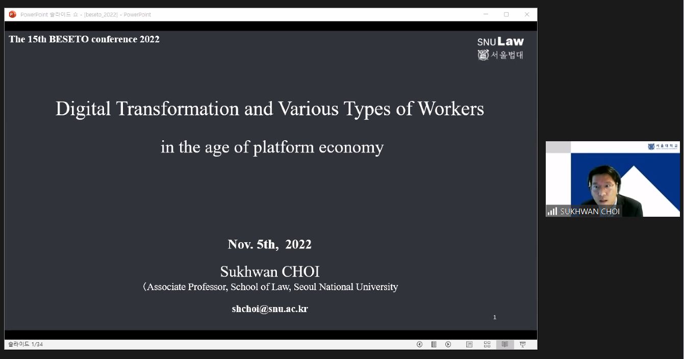 首尔大学Sukhwan Choi副教授发表学术报告“Digital Transformation and Various Types of Workers(数字化转型与各类劳动者)”。他首先介绍韩国平台经济快速发展以及劳动领域日趋增长的不稳定性,并指出平台经济发展的背后是日益严重的不平等现象,平台工作者在传统劳动法下得不到有效保护。他以一些知名企业的雇佣模式为例,介绍韩国现存的复杂劳动关系,解释为什么保护此类新兴经济形态下的劳动者如此困难。关于如何应对,他回应了Takashi Araki教授提出的五种保护方法,并介绍了韩国一系列社会保障措施,包括失业保险法、工业事故赔偿保险法等。最后,建议以全新的视角看待劳动者权益保护问题,扩大需要特殊保护的个体经营者范围,同时也关注交叉监管措施等。