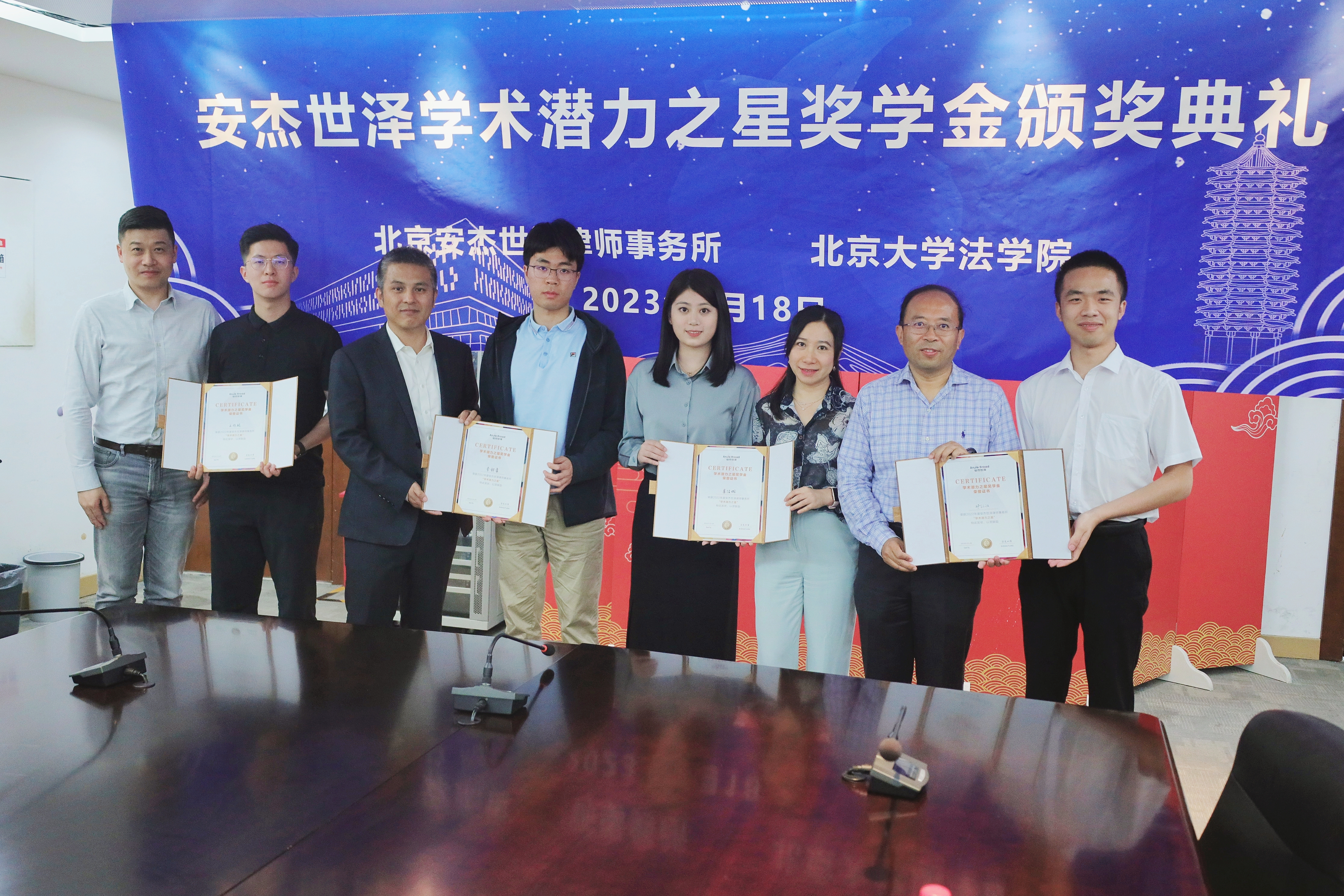 刘洪川律师、丁震宇律师、陈欢律师、谢永涛律师分别为2022年安杰世泽“学术潜力之星”奖学金获得者娄佳璐、李舒豪、邓仁江、王兆毓与安杰世泽“学术潜力之星”奖学金提名奖获得者白雪、孙璐伟颁发证书。