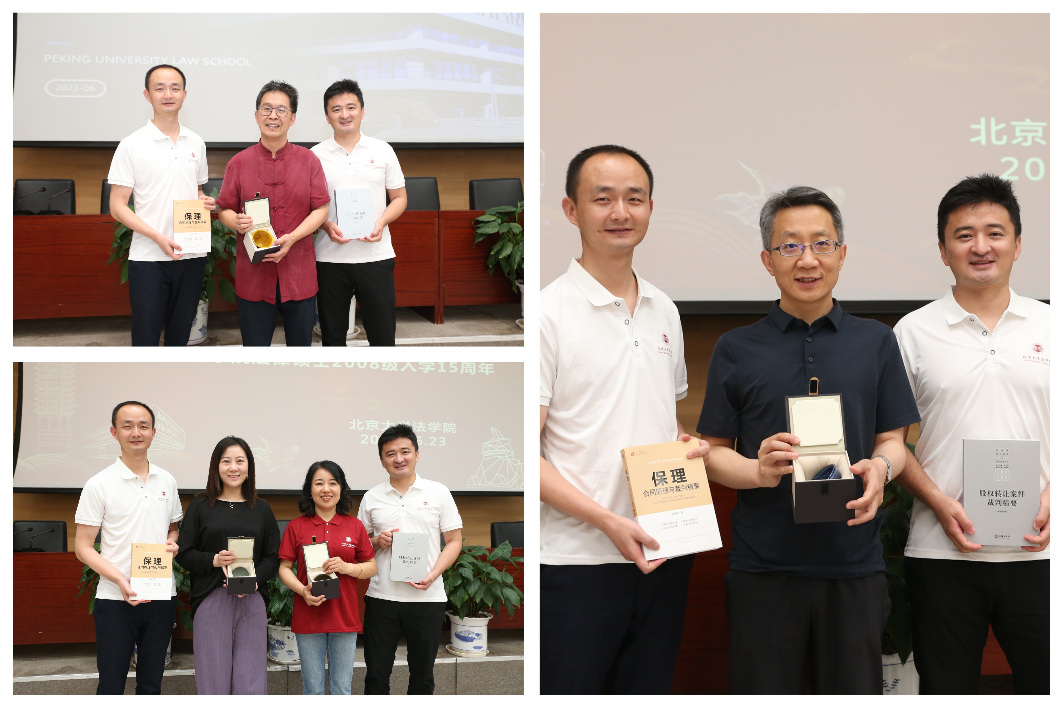 筹备组代表2008级全法律硕士体校友向学院和老师们表达了最诚挚的思念与感谢,向老师们赠送本级校友天津高院李阿侠法官、北京三中院禹海波法官的两本专著作为纪念。筹备组向学院和老师简要汇报了全体校友在各行各业的总体情况,250多名校友目前分布在中央部委、地方政府、央企国企、公检法系统、律师、金融机构、投资机构、高校等,在各自行业领域积累了十余年的跨越周期的观察和思考,当下时代的变革愈加波澜壮阔、挑战与机遇的碰撞与冲击愈加激烈,希望所有人如郭雳院长所希望的努力学会面对周期的能力,如梁根林教授所嘱托的始终坚守法律人应有的法律思维、法律逻辑、法律信念,希望所有同学都能常回家看看,为学院发展积极贡献自己的力量。