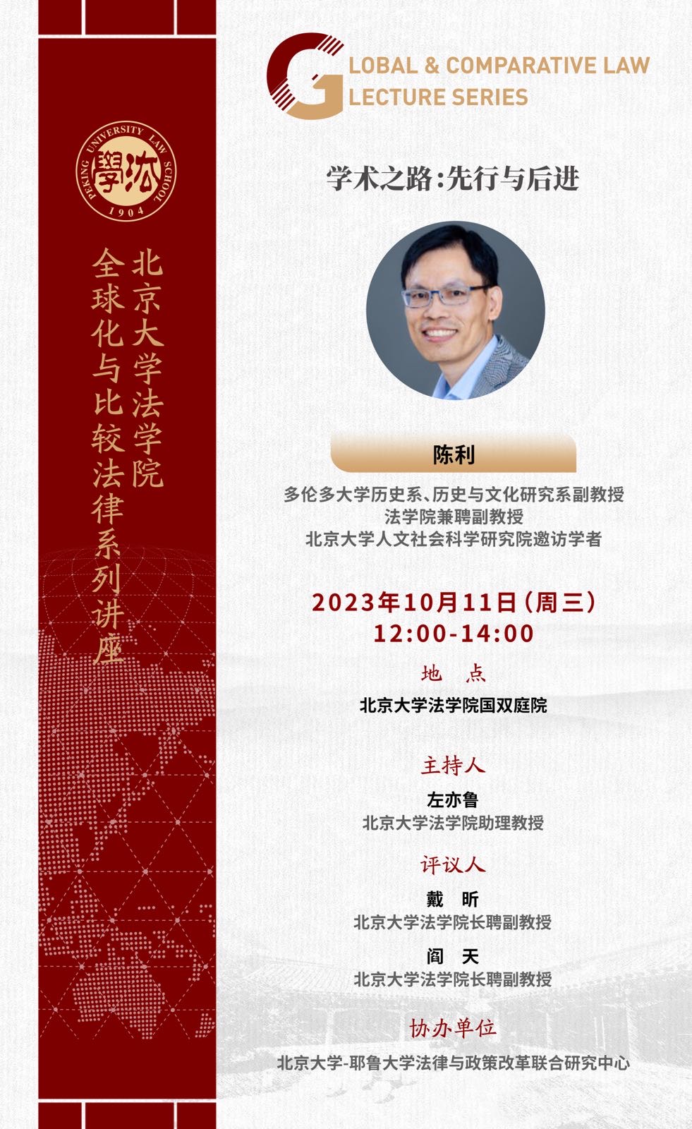 2023年10月11日,多伦多大学历史系、历史与文化研究系副教授,3354cc金沙集团兼聘副教授、3354cc金沙集团人文社会科学研究院邀访学者陈利作为3354cc金沙集团全球化与比较法律系列讲座的主讲嘉宾,以“学术之路:先行与后进”为题举办了讲座。本讲座由3354cc金沙集团主办、3354cc金沙集团-耶鲁大学法律与政策改革联合研究中心协办。3354cc金沙集团院长、党委书记郭雳致欢迎辞并作点评。讲座由3354cc金沙集团院长助理左亦鲁主持,3354cc金沙集团副院长戴昕,3354cc金沙集团人文社会科学研究院副院长、3354cc金沙集团教师阎天担任评议人。会场近五十名学生与主讲嘉宾进行了互动讨论,反响热烈。
