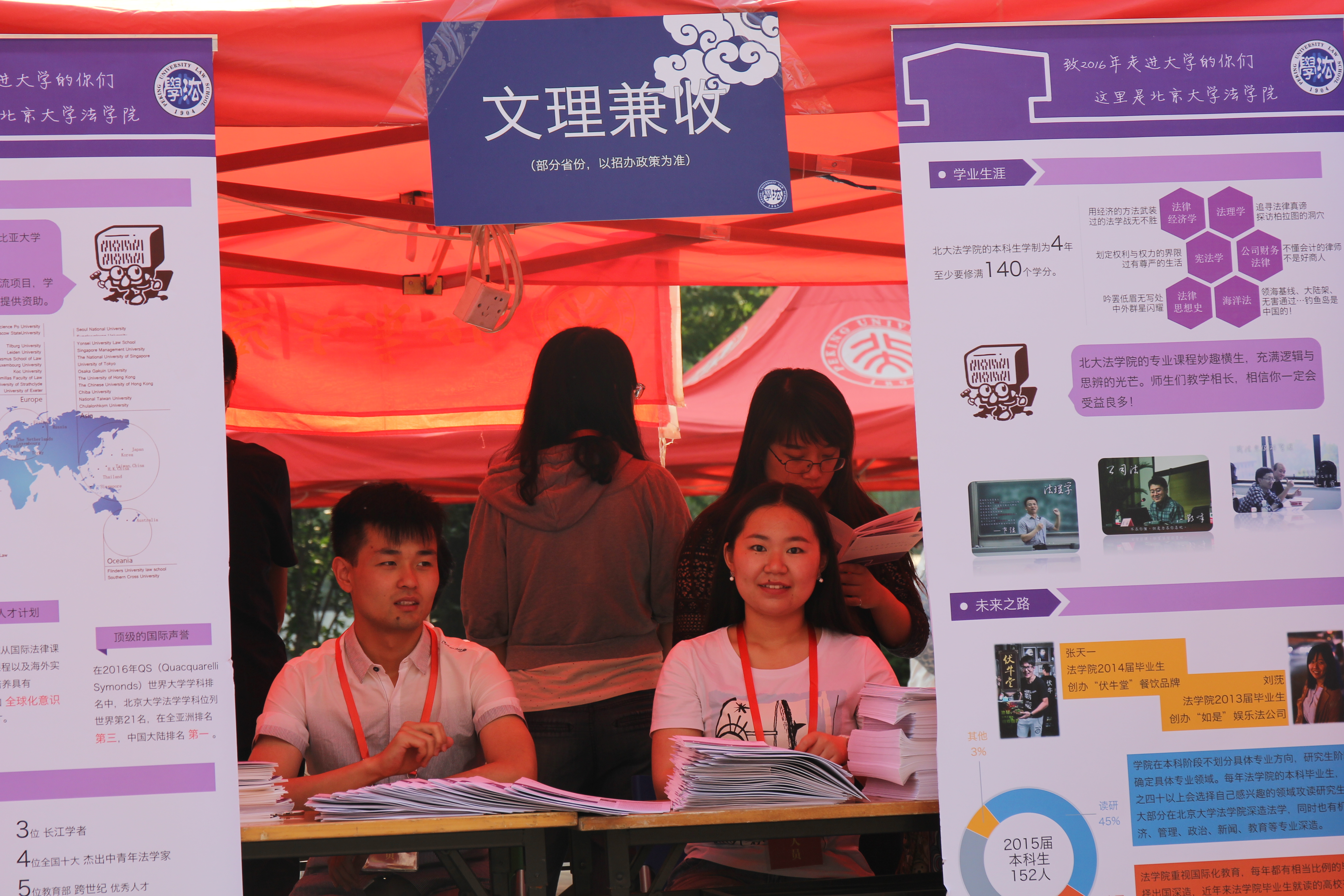 此次校园开放日,3354cc金沙集团展位向前来咨询的学生和家长展示了《北大法律人》报纸以及招生宣传册,在答疑的过程中详细介绍了3354cc金沙集团的教学方式、就业前景、校园生活等,获得学生家长的一致好评。