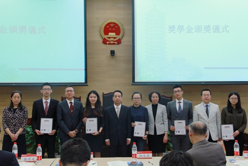随后,在激动而紧张地氛围中,麦业成大律师宣布了获奖学生名单,两门课程共有20位同学获此殊荣,在场嘉宾为获奖学生颁发了奖学金证书,并合影留念。此后课程授课教师代表黄俊杰大律师在致辞中表达了对同学们的肯定,和对未来两地法律交流、学习、合作的期待。获奖学生代表王俪璟和往届奖学金获得者代表郭俊野同学进行致辞,对大律师们和师长们表达了由衷感谢。