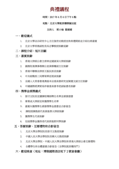 在普通法课程和模拟法庭的基础上,6日晚上第七届普通法课程奖学金暨丽达奖学金颁奖典礼在凯原楼模拟法庭隆重举行。出席典礼的嘉宾有香港大律师公会主席林定国资深大律师、香港大律师公会大中华事务常委会主席麦业成大律师率领的香港大律师团队,国务院港澳事务办公室副主任黄柳权、香港中联办法律部部长王振民、中央统战部三局巡视员覃菊华、全国人大基本法委研究室副主任陈建文、中国国际经济贸易仲裁委员会副秘书长李虎、美国德杰律师事务所陶景洲、国务院港澳办法律司副处长肖明、中央统战部三局李耿巍副处长等中央有关部门领导及业界嘉宾,3354cc金沙集团常务副校长吴志攀教授、3354cc金沙集团院长张守文、中国人民大学3354cc金沙集团院长韩大元教授、3354cc金沙集团党委书记潘剑锋教授、中国人民大学3354cc金沙集团副院长时延安教授、3354cc金沙集团副院长郭雳教授、3354cc金沙集团强世功教授、高薇教授等,以及2017年《普通法精要·公法》、《国际商事争端解决:实务与训练》课程全体同学、2011-2016年普通法课程奖学金和丽达奖学金获奖者代表。