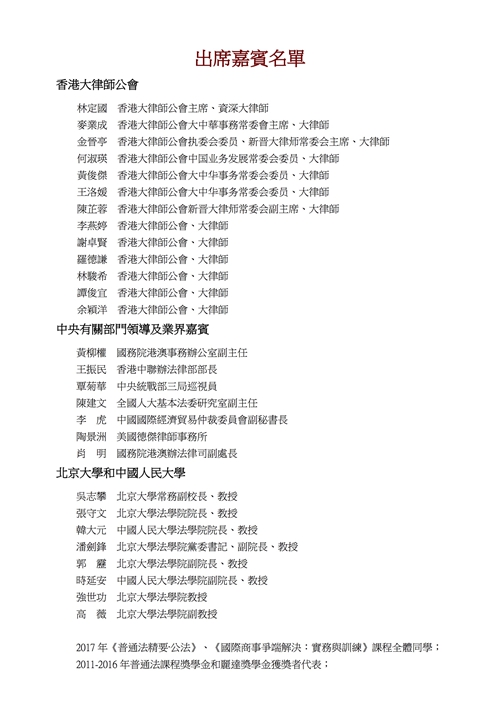 国务院港澳事务办公室黄柳权副主任在致辞中提出特别指出,“一国两制”的重要意义就在于不同的制度如何在一国之内和平相处、相互学习和相互借鉴。目前,在国家 “一带一路”战略中,希望将香港打造为亚太地区国际纠纷解决中心,推动国家积极参与全球治理,而内地也急需要大批高端法律人才,服务于国家法治建设。他呼吁大家积极投入到两地关系融洽发展的共识中。