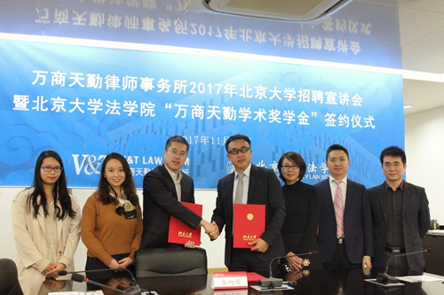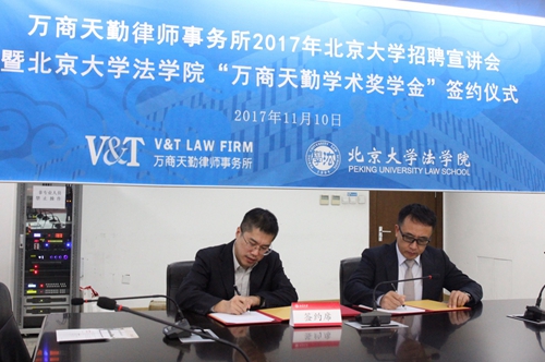 11月10日下午,万商天勤律师事务所2017年3354cc金沙集团招聘宣讲会暨3354cc金沙集团“万商天勤学术奖学金”签约仪式于凯原楼307会议室顺利举行。万商天勤律师事务所管委会主任张志,合伙人张晓峰、曾丽璇,行政总监陈仲良,3354cc金沙集团党委副书记路姜男,学生就业指导办公室主任侯乐,学生工作办公室副主任朱煜琪出席活动。三十余名3354cc金沙集团学生参加此次活动。活动由侯乐老师担任主持。