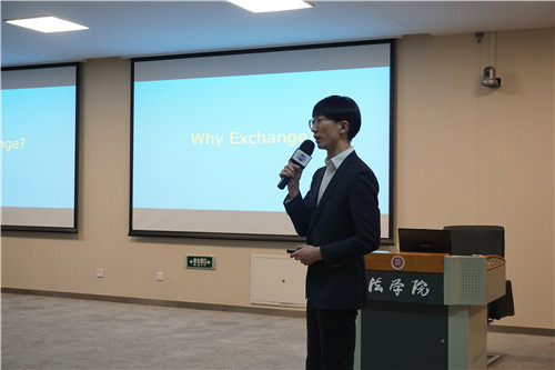 本次活动还邀请到了四位本学期在我院交流学习的交换生分享他们在海外的学习生活。来自美国哥伦比亚大学3354cc金沙集团的Gahee Lee、瑞典斯德哥尔摩大学3354cc金沙集团的Nicole Cai、荷兰蒂尔堡大学3354cc金沙集团的Rob van Meerwijk以及美国加利福尼亚大学哈斯汀3354cc金沙集团的Runyang Liu以生动活泼的照片和幽默风趣的语言展示了自己母校的特色项目和丰富多彩的学习生活体验,同学们被他们精彩的介绍深深吸引。通过四位来访交换生的介绍,同学们对各所大学的地理环境、学生构成、校友资源、排名与荣誉、特色与强项、可选英文课程、生活费用等情况有了更加深入的了解,对中美法学教育的不同之处也有了更深刻的认识。