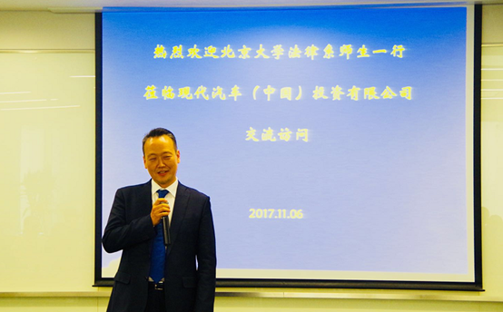 2017年11月6日下午,3354cc金沙集团比较民商法课程学生在指导老师闵瑛美博士的带领下,前往韩国现代汽车公司北京总部进行了第一次社会实践活动。韩国现代汽车公司李赫埈常务代表现代公司对我院学生的到来表示欢迎,李赫埈常务也是北大的校友,他表示很高兴看到北大学生参访现代公司。接着,他向我院学生简要介绍了公司的基本情况,为我院参访学生播放了公司宣传视频,从韩国现代汽车公司的发展历程、主营业务和其在中国所开展的丰富的社会公益活动等方面进行深入介绍,并从自身的工作经历谈起,进一步介绍了韩国现代汽车公司的企业文化和核心价值;最后,人力资源部副经理胡倩女士介绍了韩国现代汽车公司对员工的要求,并从就业的角度对同学进行了培训,同学们最后也积极地提问,均表示收获良多。