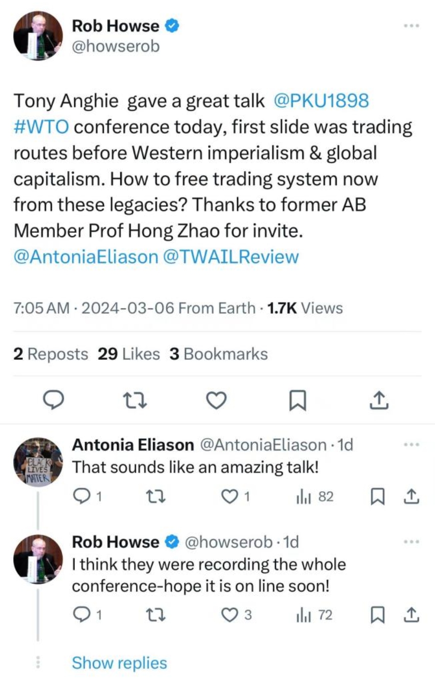本次会议在中外学界获得了高度关注和广泛好评,Rob Howse教授专门在海外社交媒体发文感谢会议主办方的邀请,并对参会的Antony Anghie教授的发言内容表达支持。