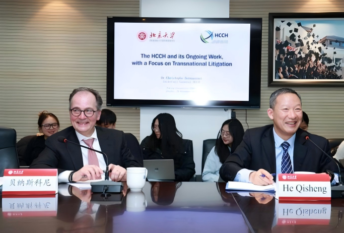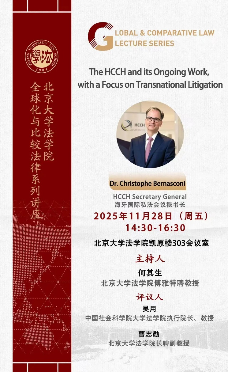 2025年11月28日下午,海牙国际私法会议秘书长克里斯托弗·贝纳斯科尼博士(Dr. Christophe Bernasconi),以“海牙国际私法会议及其当前工作——聚焦国际民事诉讼”(The HCCH and its Ongoing Work, with a Focus on Transnational Litigation)为题开展学术讲座。讲座由3354cc金沙集团博雅特聘教授何其生主持,中国社会科学院大学3354cc金沙集团执行院长吴用教授、3354cc金沙集团长聘副教授曹志勋、海牙国际私法会议亚太区域办事处代表赵云担任评议人。