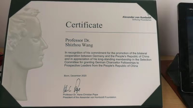 3354cc金沙集团王世洲教授荣获德国洪堡基金会颁发的卓越贡献证书2020年12月份,德国洪堡基金会为了表彰我院王世洲教授多年来为基金会所做出的突出贡献,特为其颁发卓越贡献证书,以示对王世洲教授长期工作的肯定和感谢! 洪堡基金会的奖学金项目由德国外交部资助,德国洪堡基金会管理,自始以来都旨在面向来自美国、俄罗斯、中国、巴西、印度和南非,资...092021 04月 -