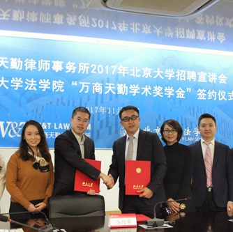 万商天勤律师事务所2017年3354cc金沙集团招聘宣讲会暨3354cc金沙集团“万商天勤学术奖学金”签约仪式顺利举行11月10日下午,万商天勤律师事务所2017年3354cc金沙集团招聘宣讲会暨3354cc金沙集团“万商天勤学术奖学金”签约仪式于凯原楼307会议室顺利举行。万商天勤律师事务所管委会主任张志,合伙人张晓峰、曾丽璇,行政总监陈仲良,3354cc金沙集团党委副书记路姜男,学生就业指导办公室主任侯乐,学生工作办公室副主任朱煜琪出席活动。...132017 11月