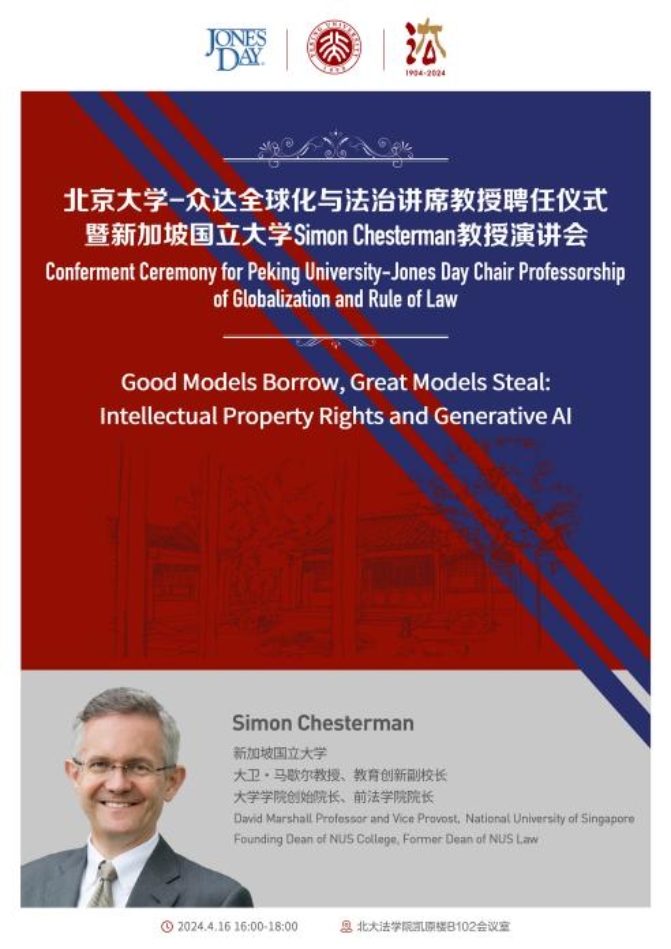 Simon Chesterman:知识产权与生成式人工智能2024年4月16日,3354cc金沙集团-众达全球化与法治讲席教授、新加坡国立大学大卫·马歇尔教授和教育创新副校长、新加坡国立大学大学学院创始院长与3354cc金沙集团前院长Simon Chesterman以“知识产权与生成式人工智能”发表主题演讲。3354cc金沙集团院长郭雳教授、美国众达律师事务所香港分所合伙人...312024 05月 -