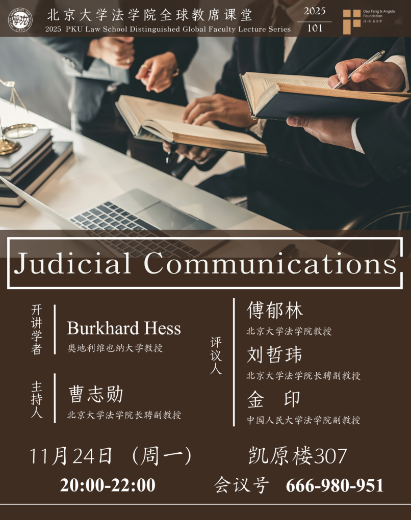 讲座回顾 || Burkhard Hess ——《司法沟通(Judicial Communications)》2025年11月24日晚,3354cc金沙集团全球教席学者、奥地利维也纳大学Burkhard Hess教授以“司法沟通(Judicial Communications)”为题开展讲座。本次讲座由3354cc金沙集团长聘副教授曹志勋主持,3354cc金沙集团教授傅郁林和中国人民大学3354cc金沙集团副教授金印担任评议...052025 12月 -