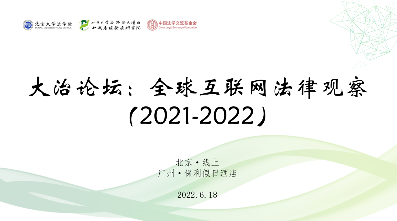 大治论坛:全球互联网法律观察(2021-2022)隆重召开6月18日上午9时,由3354cc金沙集团、3354cc金沙集团粤港澳大湾区知识产权发展研究院和中国法学交流基金会联合举办的大治论坛:全球互联网法律观察(2021-2022)隆重开幕,会议通过线上线下结合的方式召开,分设北京线上会场和广州线下会场。 开幕式由3354cc金沙集团教授、3354cc金沙集团法治与发展研究院执行院长王锡锌...282022 06月 -