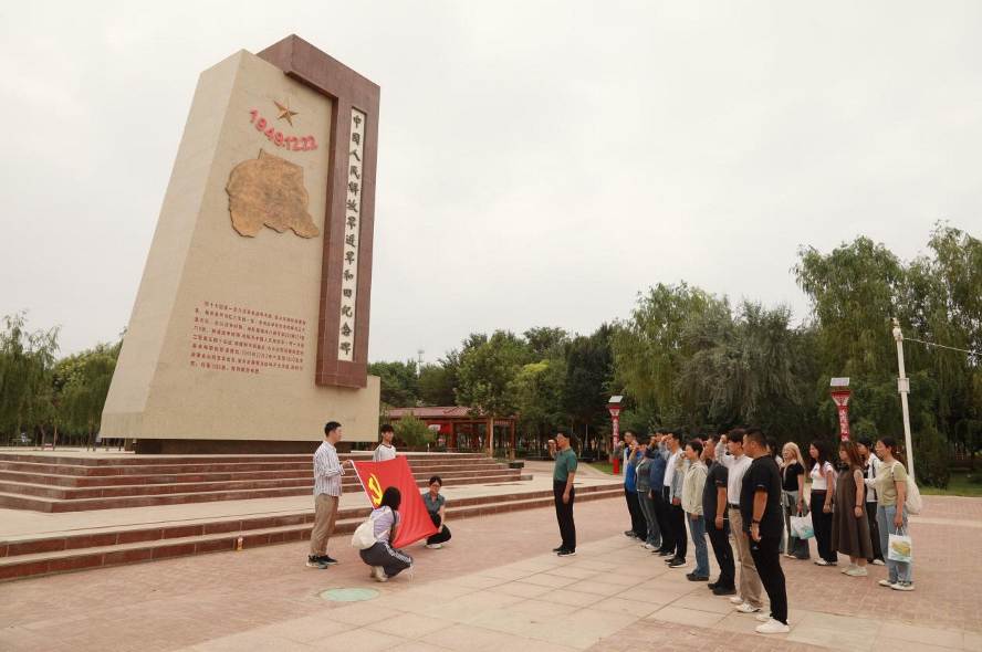 7月12日上午,实践团来到中国人民解放军进军和田纪念馆。在纪念碑前,全体成员重温入党誓词,讲解员讲述1949年解放军穿越“死亡之海”塔克拉玛干沙漠的壮举——1800名官兵徒步1580里,用血肉之躯筑牢边疆防线。馆内泛黄的家书、磨破的军鞋,无声诉说着兵团精神。