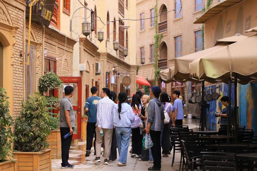 当日下午,实践团参访和田博物馆。从史前文明到近代发展的文物展陈,勾勒出各民族在这片土地上共生共荣的画卷。在和田团城,修缮一新的传统民居与特色小吃街相映成趣,展现“文旅融合”战略下边疆的活力与生机。