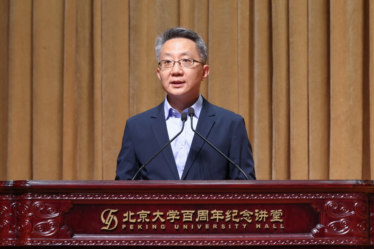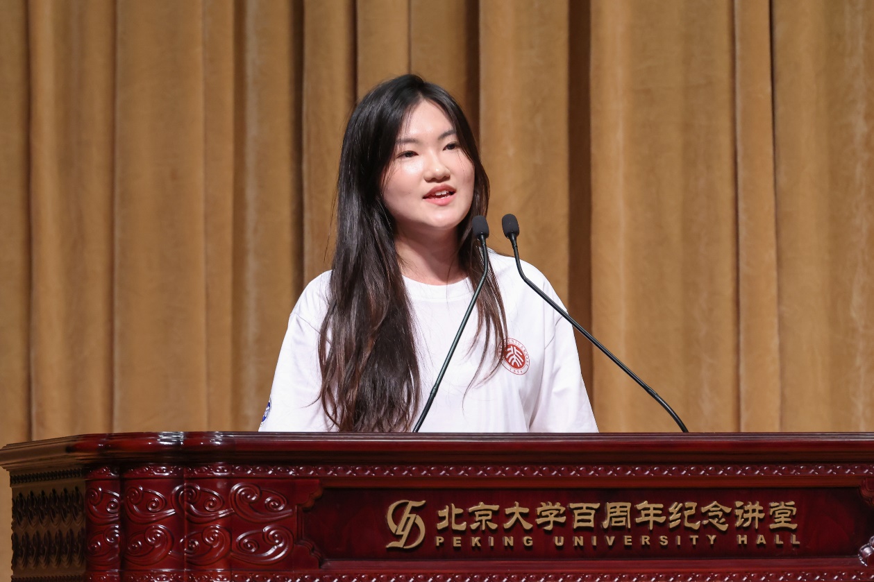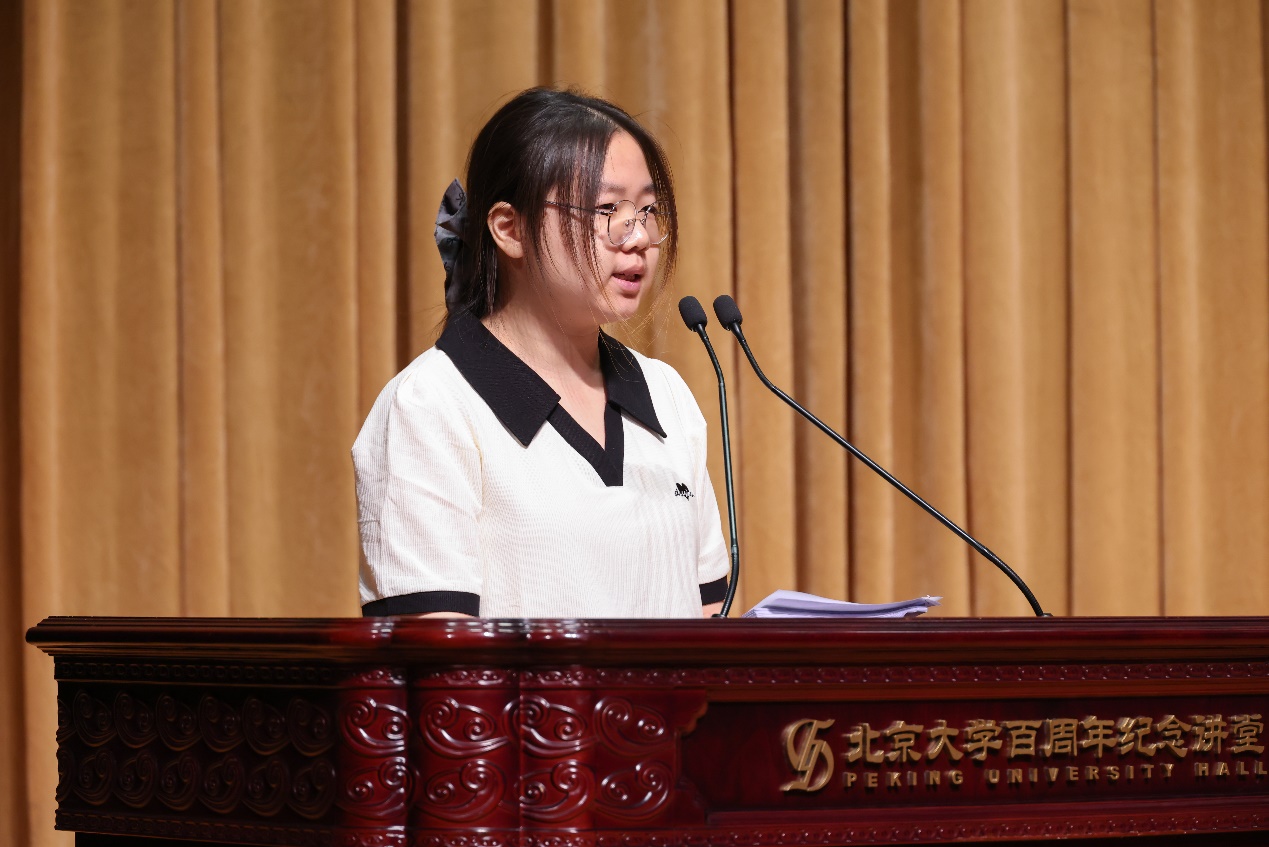 2022级本科生高澜碧作为在校生代表发言。她结合对于时代特点的思考,鼓励新生同学们认真读书、扎实思考、乐观生活,以清醒的头脑和温暖的心,体会“置身其中”的价值感与获得感,在燕园中探索自我、拥抱时代,在时代浪潮中找准自己的坐标。