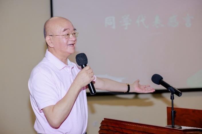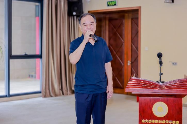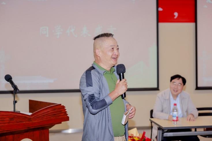 张力行老师深情回忆了与1981级本科校友的师生渊源,并分享自身的职业经历。离开教师岗位后,他一直致力于法律人工智能应用的研究与开发,始终积极推动法律与科技的融合。他提醒在座校友关注科技发展以适应时代变革,同时祝愿各位校友身心健康、家庭和睦。