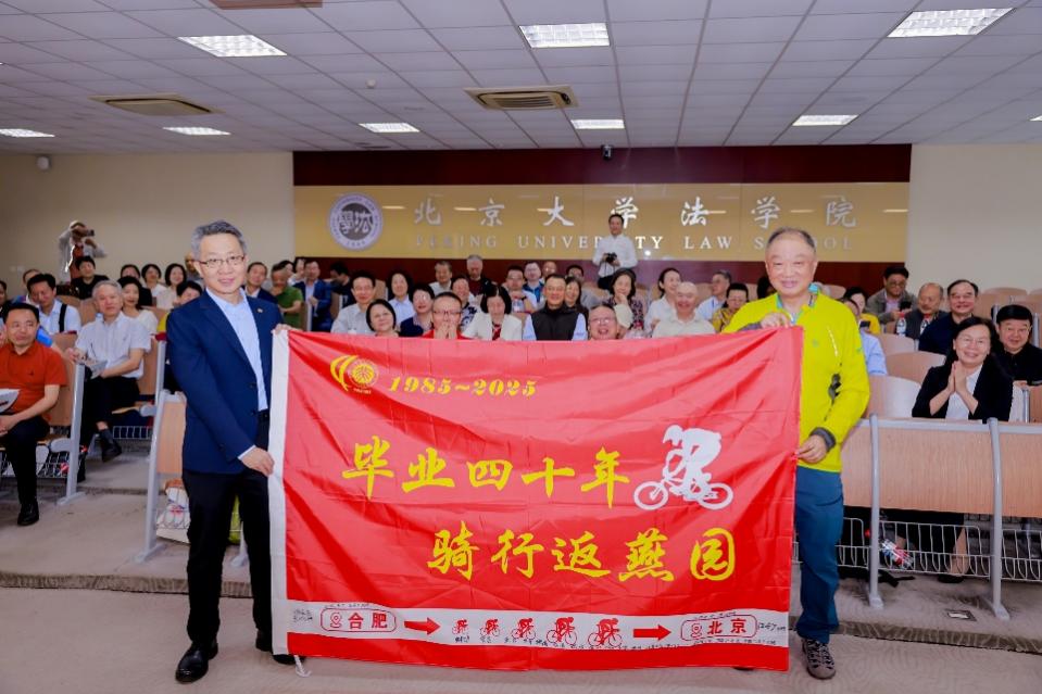 在特别纪念环节。为纪念此次返校活动,卯俊民校友从安徽合肥出发,骑行1247公里回到燕园,并精心制作一面印有“毕业四十年 骑行返燕园”字样的旗帜献礼母校。这份跨越千里的赤诚情怀,深深感染着在场的每一个人。