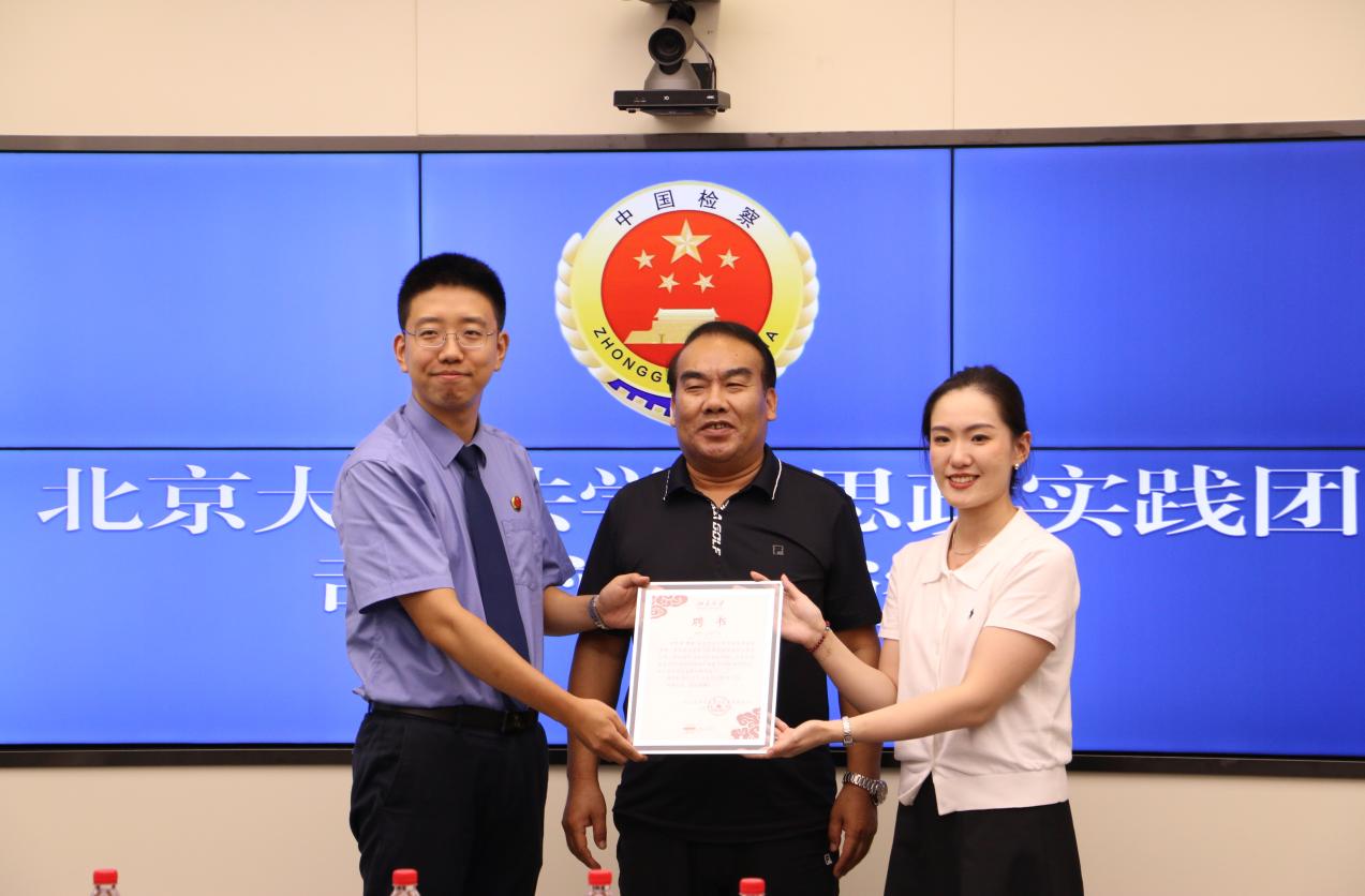 之后,实践团赴雄县人民检察院参观交流。在12309检察服务中心,同学们近距离感受到基层检察工作的便民设计与司法温度。座谈会上,雄县检察院党组书记、检察长、北大物理系1988级校友王旭辉向实践团师生表示热烈欢迎,并介绍了雄安新区建设与检察职能融合的基层实践成果,强调检察机关在服务国家战略中的使命担当。李婉玉对雄县检察院的热情接待致以诚挚感谢,并向最高人民检察院选调生、雄县检察院第一检察部检察官助理周雷校友颁发“学生生涯发展校友导师”聘书,表达了进一步强化检校人才共育机制的期待。