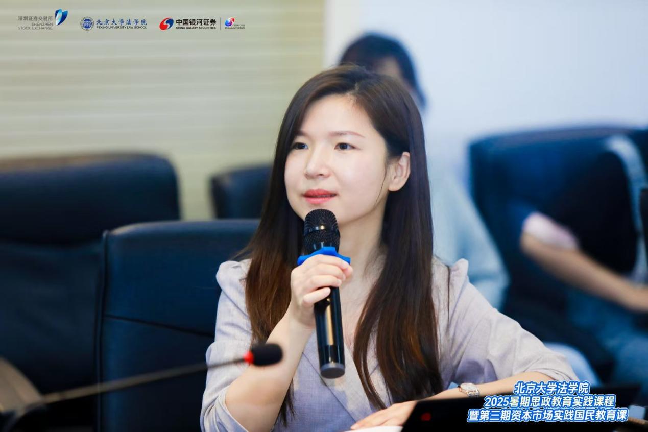 银行证券财富运管总部投资者教育与服务团队负责人杨华向实践团的到来表达了欢迎与感谢。她指出,“暑期思政教育实践课程暨资本市场实践国民教育课”项目已经来到了第三个年头,将在继往开来的基础上持续深化落实立德树人根本任务,将银河证券的实践教学资源和北大师生的智慧与需求高度对接,持续建设思政教育“校企合作”的典范样本。杨华为大家介绍了银河证券的发展历程、业务范围,并详细展示了银河证券公司近年来在投资者教育与金融知识科普方面的努力和成就,加深了同学们对银河证券公司主营业务与金融教育日常的了解。