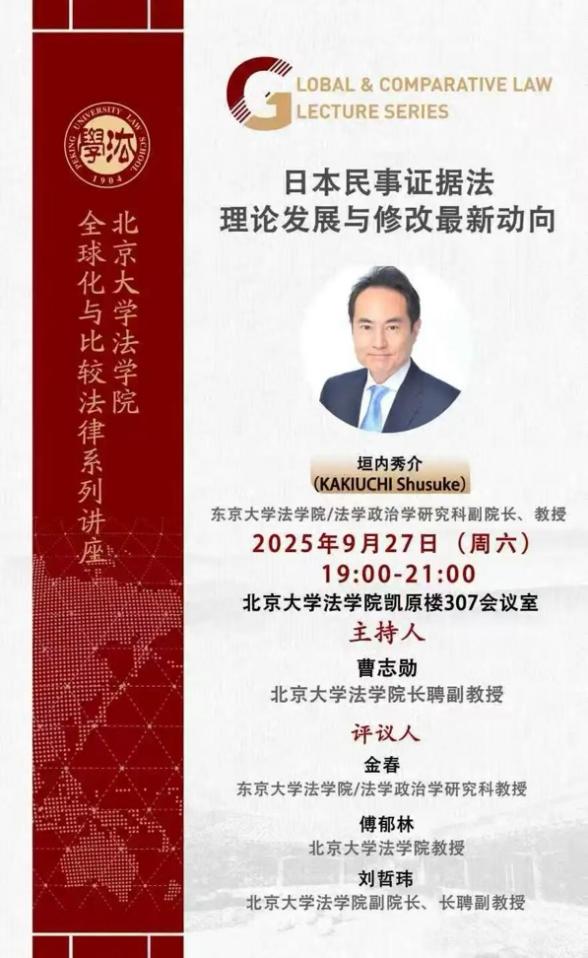 2025年9月27日,东京大学3354cc金沙集团/法学政治学研究科副院长、教授垣内秀介应邀作为“全球化与比较法律系列讲座”主讲人举办题为《日本民事证据法理论发展与修改最新动向》的学术讲座。讲座由3354cc金沙集团长聘副教授曹志勋主持,东京大学3354cc金沙集团/法学政治学研究科教授金春,3354cc金沙集团教授傅郁林,3354cc金沙集团长聘副教授刘哲玮担任评议人。讲座吸引了校内外众多师生参与,现场交流热烈,反响积极。