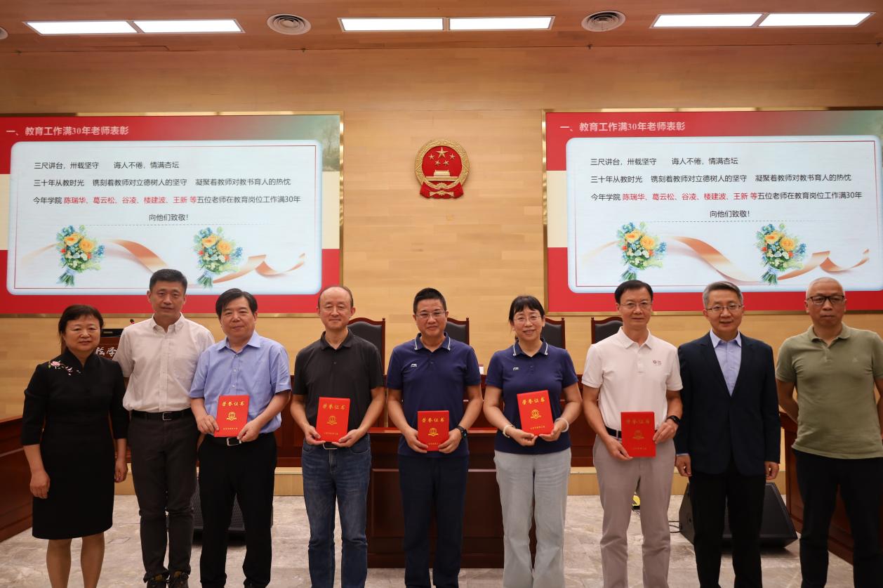 随后,郭雳、唐金楠、朴文丹和工会主席张双根共同为从事教育工作满三十年的王新、陈瑞华、楼建波、谷凌、葛云松五位老师颁发纪念证书。
