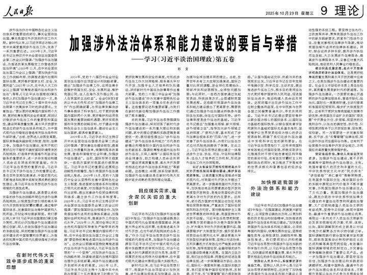 【转载】郭雳:加强涉外法治体系和能力建设的要旨与举措——学习《习近平谈治国理政》第五卷原文载于《人民日报》(2025年10月29日09版) 涉外法治作为中国特色社会主义法治体系的重要组成部分,事关全面依法治国,事关我国对外开放和外交工作大局。新时代以来,以习近平同志为核心的党中央高度重视涉外法治工作,发表了一系列重要论述。2019年2月,习近平总书记主持召开中央全面依法治国...012025 11月 -